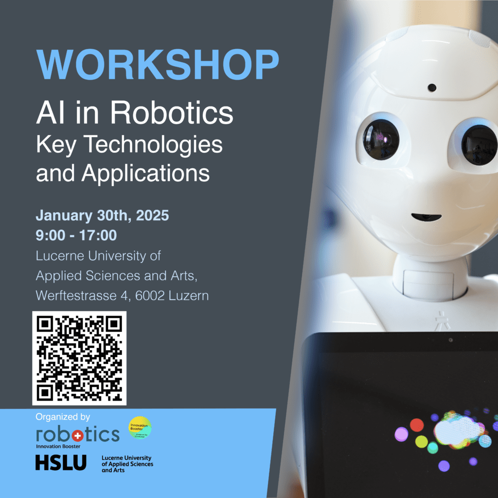 The Innovation Booster Robotics, together with the AI Robotics Research Lab from the Lucerne University of Applied Sciences and Arts (HSLU), is organizing a workshop to explore the revolutionary impact of Artificial Intelligence (AI) on robotics across various industries. This workshop will cover cutting-edge technologies and practical applications, with a focus on how AI is reshaping the fields of logistics, healthcare, and Industry 4.0.