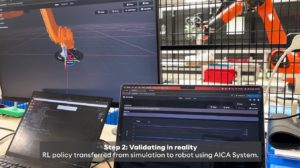 As part of this milestone, AICA deployed its AICA System on an industrial Kuka robot. The demonstration showcased an AI-based tactile control policy operating in a production setting. The system combined 3D vision, force feedback, and a neural network trained in simulation using Reinforcement Learning (RL) to control the robot.